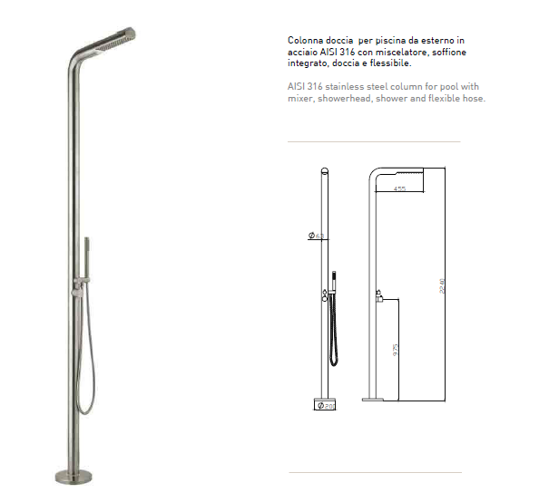 Στήλη ντους για εξωτερική πισίνα, μονόδρομος 2 κατευθύνσεων, βροχή και καταρράκτης, AISI 316.