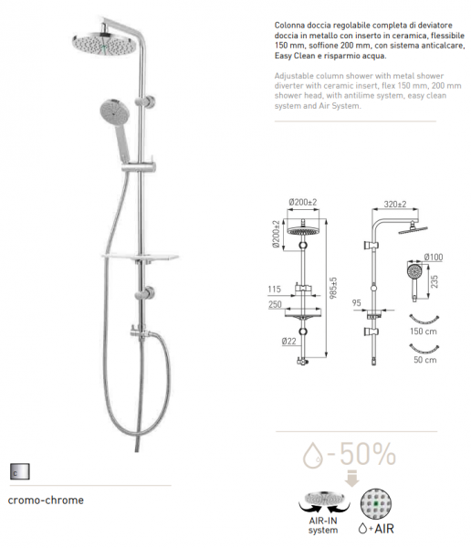 Ρυθμιζόμενη στήλη ντους πλήρης με μεταλλικό εκτροπέα ντους με κεραμικό ένθετο, εύκαμπτο 150 mm, κεφαλή ντους 200 mm, με σύστημα κατά των αλάτων, Easy Clean και εξοικονόμηση νερού.