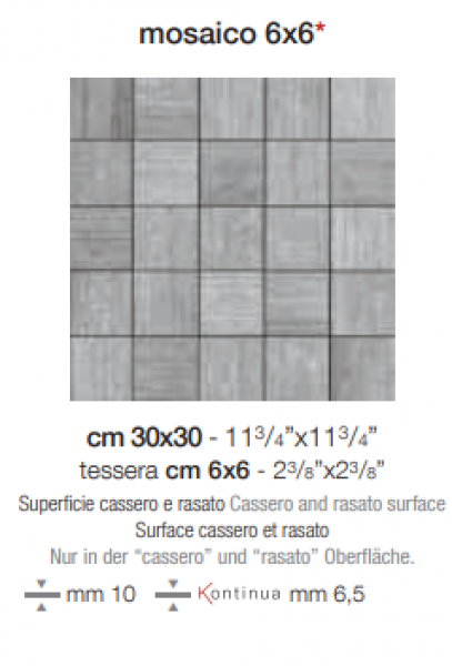cm 30x30 - 113/4”x113/4”tessera cm 6x6 - 23/8”x23/8”Superficie cassero e rasato Cassero and rasato surfaceSurface cassero et rasatoNur in der “cassero” und “rasato” Oberfläche. mm 10 mm 6,5.